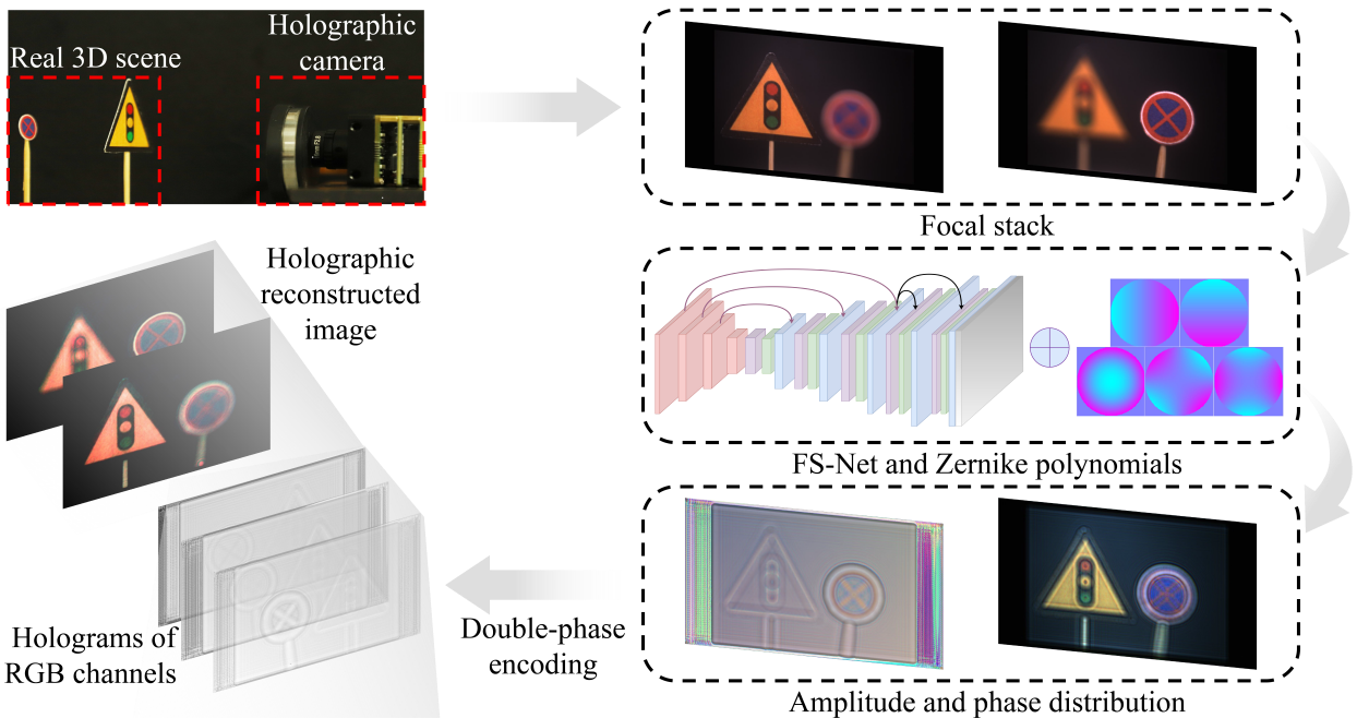 全息3D显示被认为是理想的3D显示方式。然而,由于真实3D场景的拍摄和全息图的编码需要耗费大量时间,因此,真实3D场景的全息实时显示仍无法实现。虽然研究者利用电润湿液体透镜完成了真实3D场景的快速拍摄,然而电润湿液体透镜的变焦响应时间约为100毫秒,难以满足实时拍摄真实3D场景的需求。此外,全息图的计算时间随着数据量的增加而显著增长,虽然近年来,研究人员提出了基于深度学习的全息图计算方法,有效加快了全息图的计算速度并提高了全息3D显示的质量。然而,这些方法的全息再现像与真实3D场景的离焦模糊往往是不匹配的。如何实现真实3D场景的实时拍摄和高保真全息重建是全息显示领域待解决的难题。