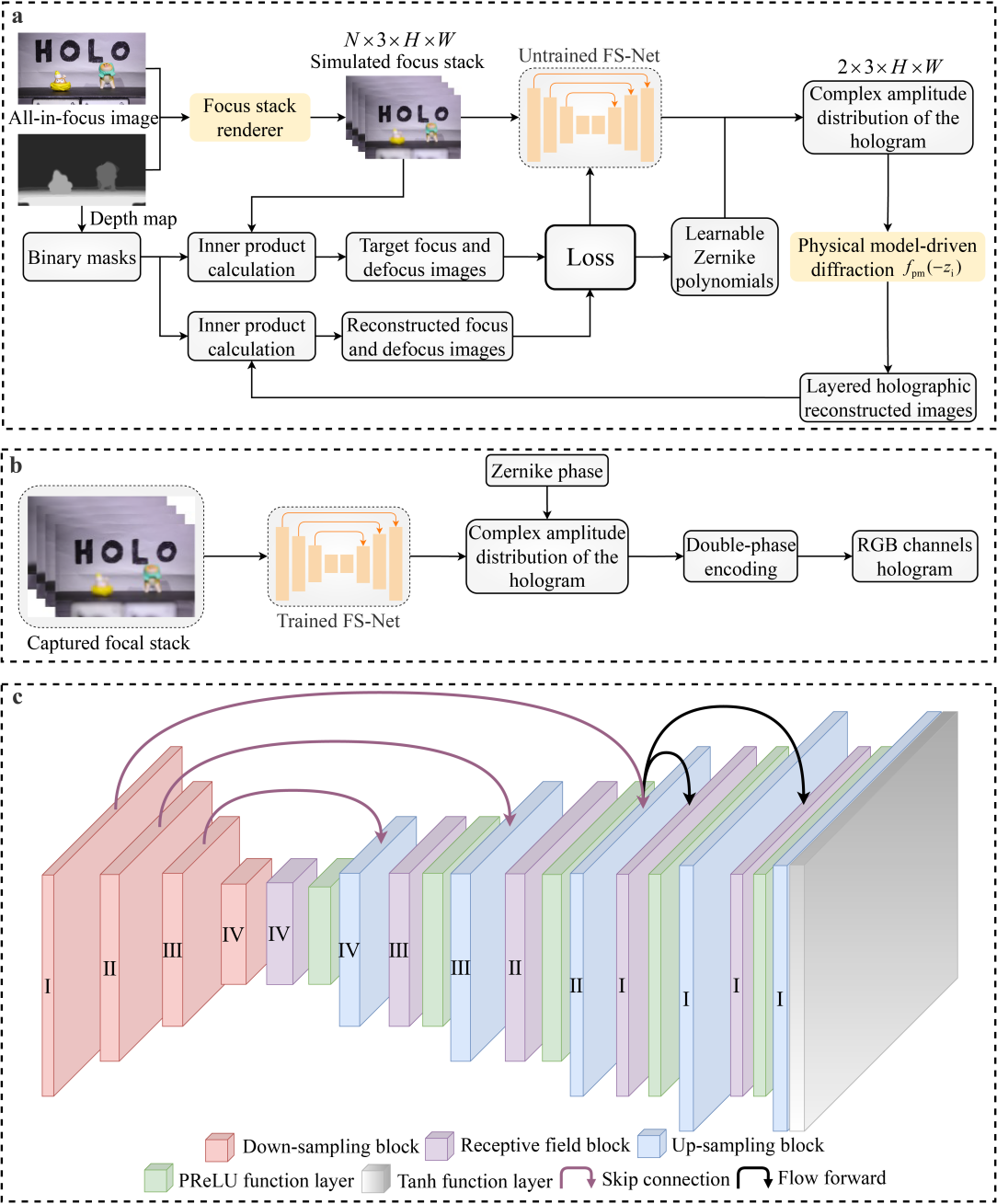 FS-Net训练和生成全息图的流程图如图3所示。与传统的基于深度学习的全息图计算方法不同,FS-Net以真实3D场景的焦点堆栈为输入,并在全息图的训练过程中使用了焦点堆栈渲染器和可学习的Zernike多项式。如图3a所示,首先,利用焦点堆栈渲染器将真实3D场景的全聚焦图和深度图处理成焦点堆栈。接着,利用未训练的FS-Net输出焦点堆栈的复振幅分布。然后,利用物理衍射模型将复振幅分布进行反向传播,得到多层全息再现像。随后,根据分层数和深度图计算多个二值掩膜,并分别计算二值掩膜与焦点堆栈和多层全息再现像的内积,进而得到目标聚焦和离焦像、重建的聚焦和离焦像。最后,计算目标聚焦和离焦像与重建的聚焦和离焦像之间的损失函数,并优化可学习的Zernike多项式和FS-Net中的参数。重复上述步骤,当网络迭代到固定次数时,FS-Net的训练就会停止。图3b是训练好的FS-Net生成全息图的流程图。将液体相机拍摄的焦点堆栈输入到训练好的FS-Net中,输出焦点堆栈的复振幅分布。在使用Zernike相位补偿复振幅分布后,利用双相位编码方法即可获得焦点堆栈的高保真全息图。