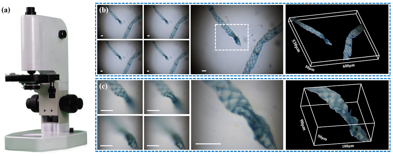 (a) 10-60倍连续光学变焦显微镜样机;(b) 10倍下不同深度的水棉样本景深扩展和三维重建实验结果;(c) 60倍下不同深度的水棉样本景深扩展和三维重建实验结果。