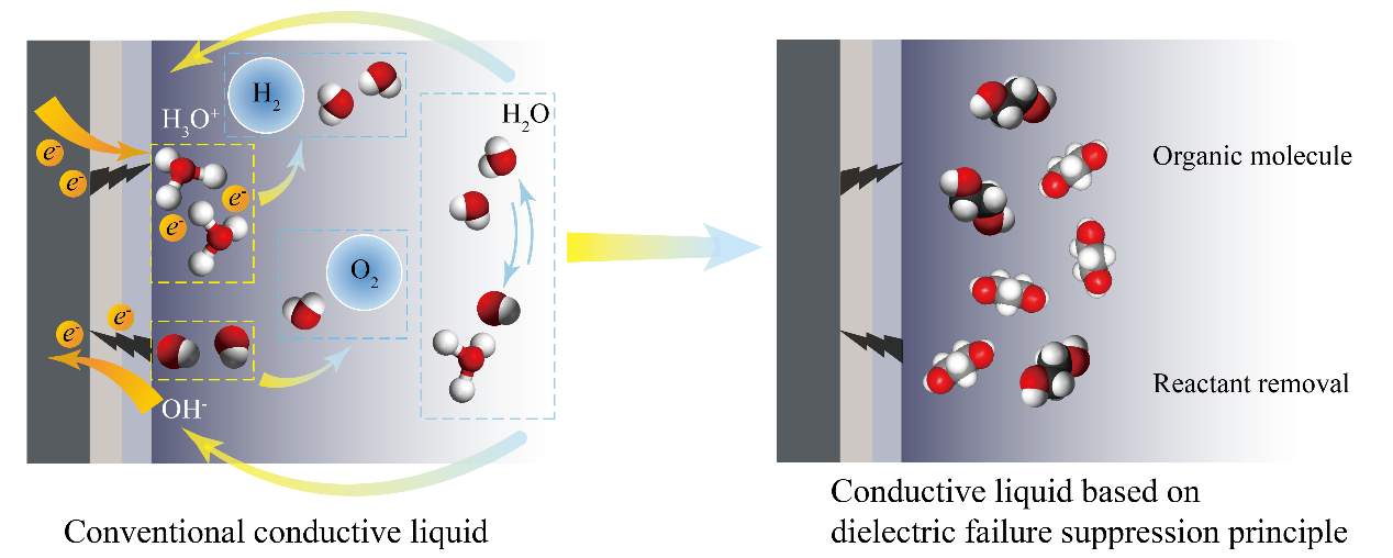 该工作首次将物理化学中电解质溶液的传递性质和电化学的反应速率的影响引入到介电失效的机理揭示中,由此得到了抑制介电失效的方法,如图2所示。通过去除参与电化学反应的反应物并控制导电液体的电导率,研究人员对电润湿导电液体材料包含的电解质离子与溶剂分子进行筛选,选择出更稳定的且不易电解的非水极性溶剂,在此基础上适量加入低浓度的有机盐离子,并综合折射率、密度和粘度等多项参数评估选出最佳的液体组分配比,最终突破了10mm口径的电润湿液体透镜技术。